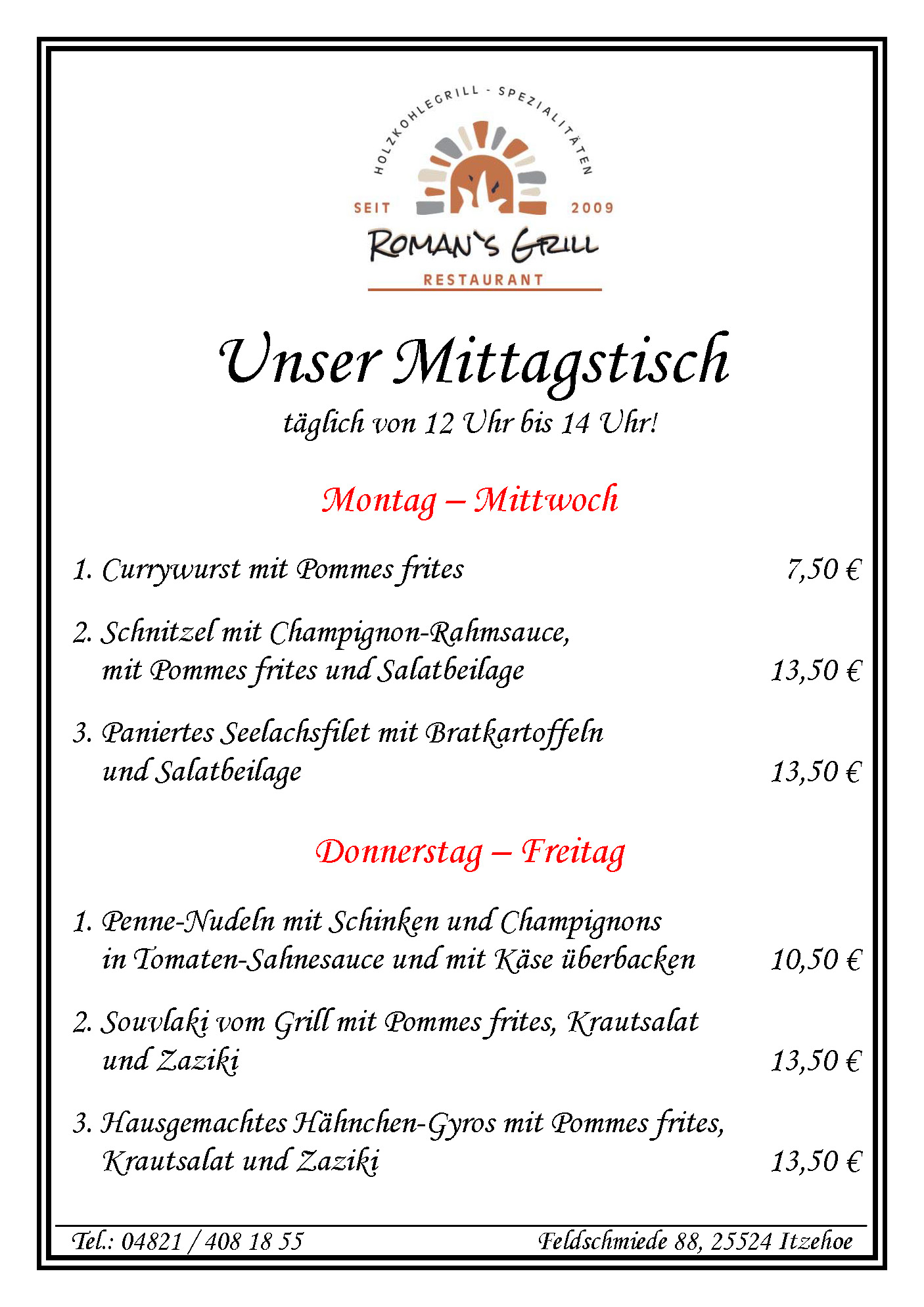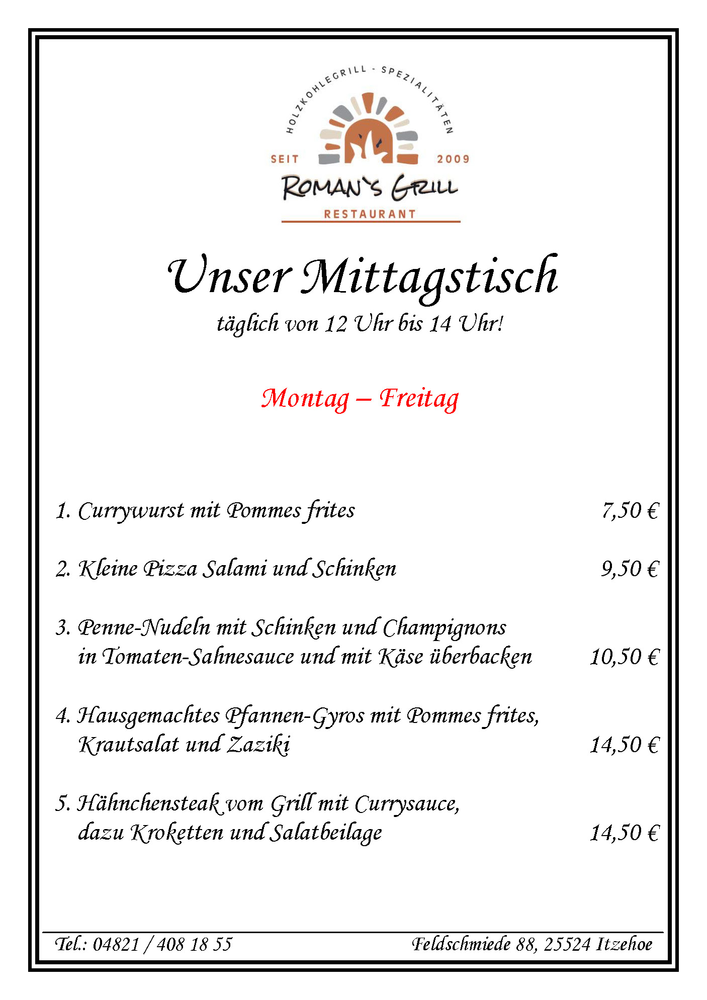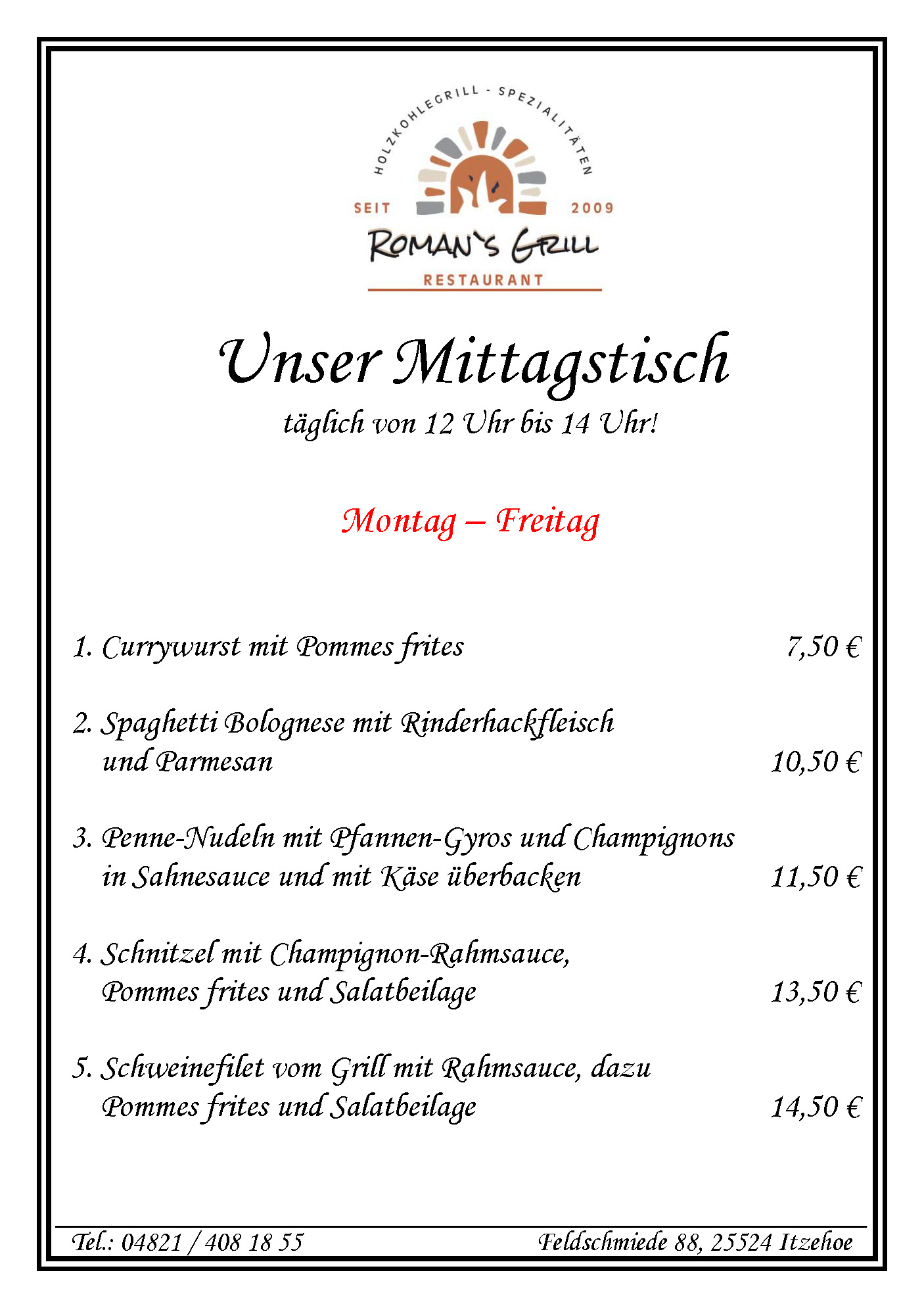 unser Mittagstisch steht von Montag bis Freitag jeweils in der Zeit von 12 Uhr bis 14:00 Uhr für Sie bereit. Unsere aktuellen Angebote finden Sie auch auf unserer Facebook-Seite.