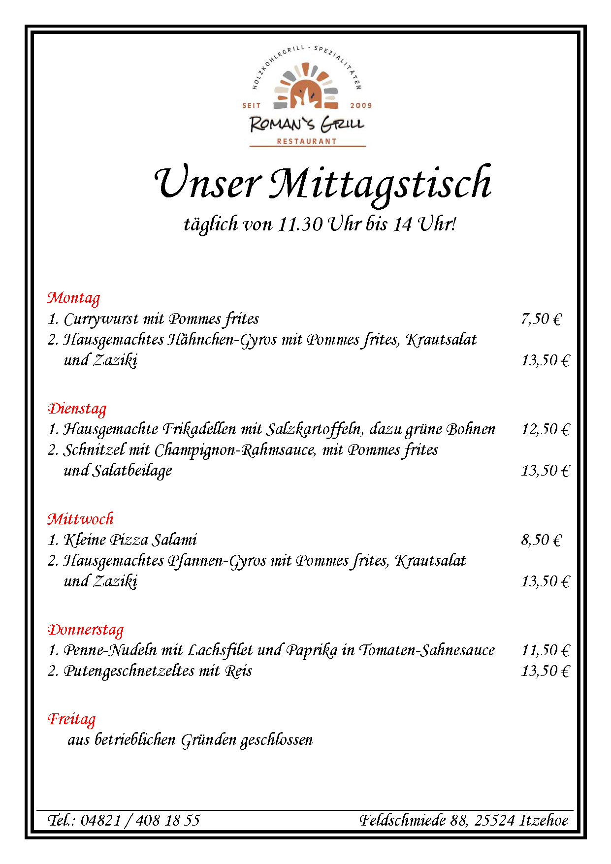 | Freitag | 11:30 - 14:00 Uhr |